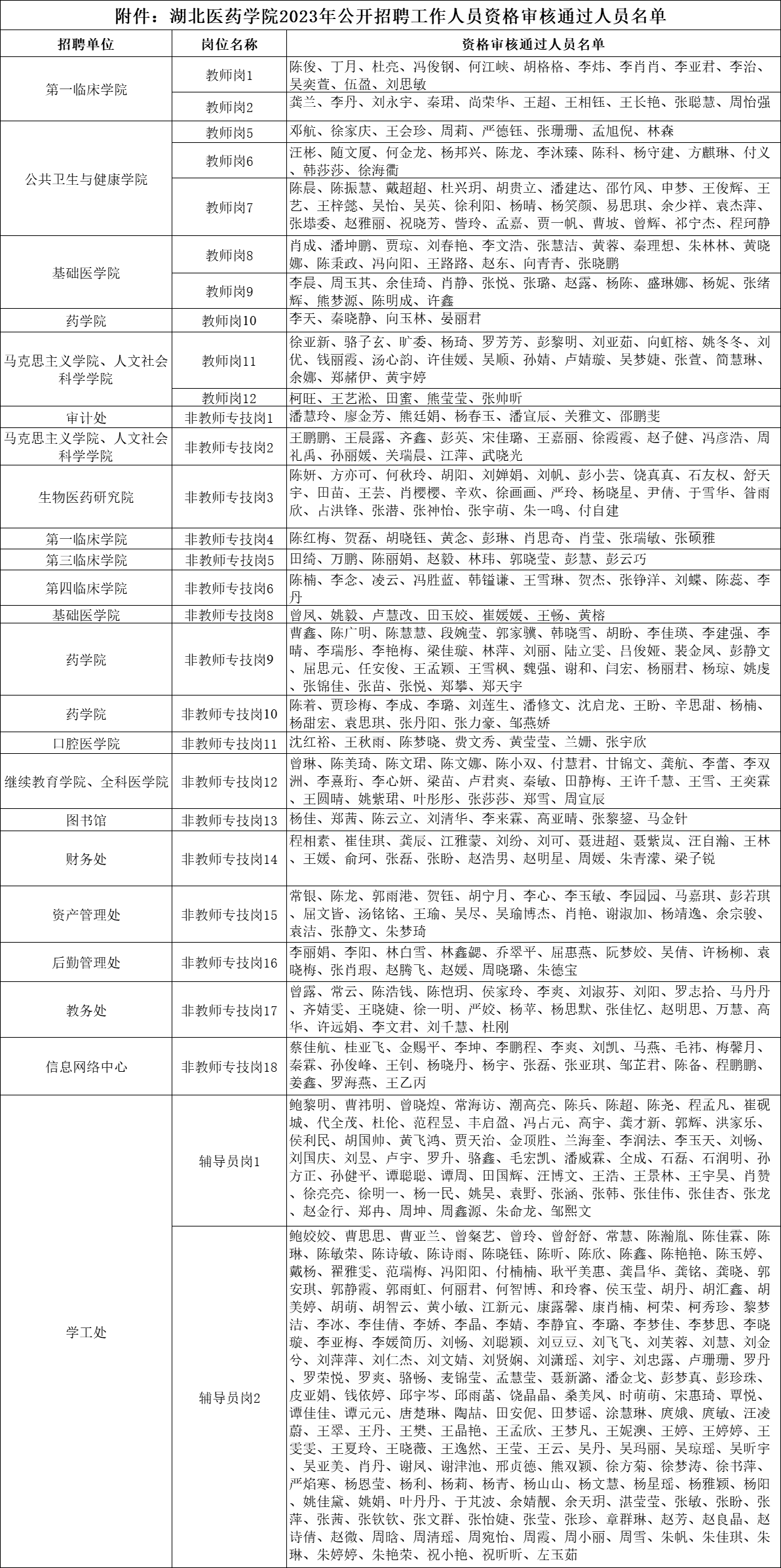 湖北医药学院2023年公开招聘工作人员资格审核通过人员名单(详见附件),现予公布。