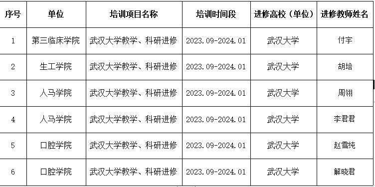 经个人申请、学院推荐、学校同意,现对2023年9月—2024年1月拟赴武汉大学进修教师信息予以公示,公示3天(2023年8月6日—2023年8月8日)。